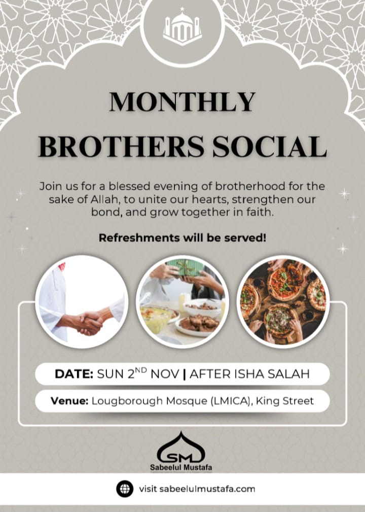 The Brothers Social this month is on Sunday 2nd November, at the Loughborough Mosque (LMICA), King Street. The event will start immediately after the Isha Prayer (7:30pm)