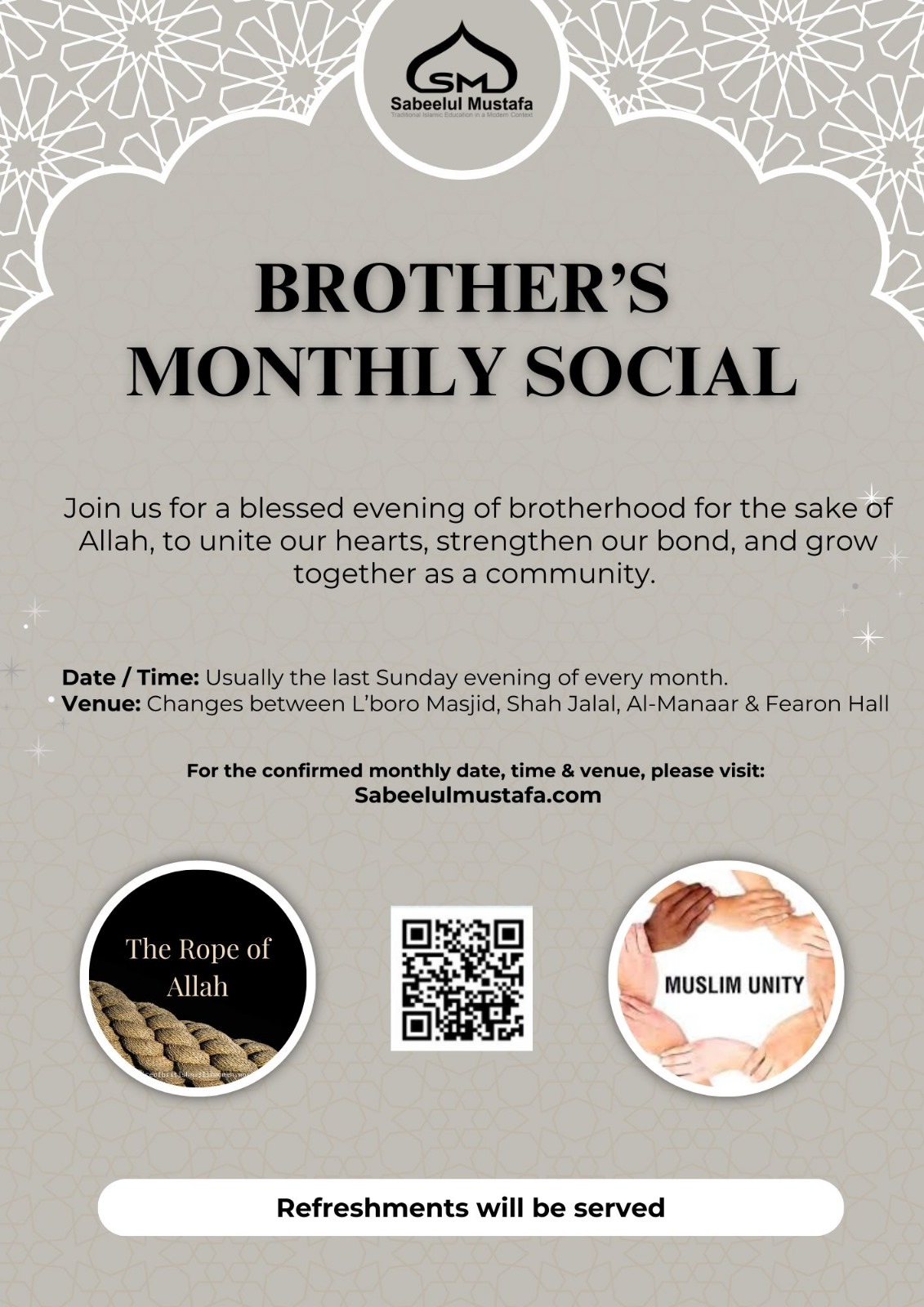 The Brothers Monthly Social is scheduled to take place on Sunday 7th December at the Shah Jalal Masjid (Rendell St) immediately after the Isha prayer (7:15pm), iA.